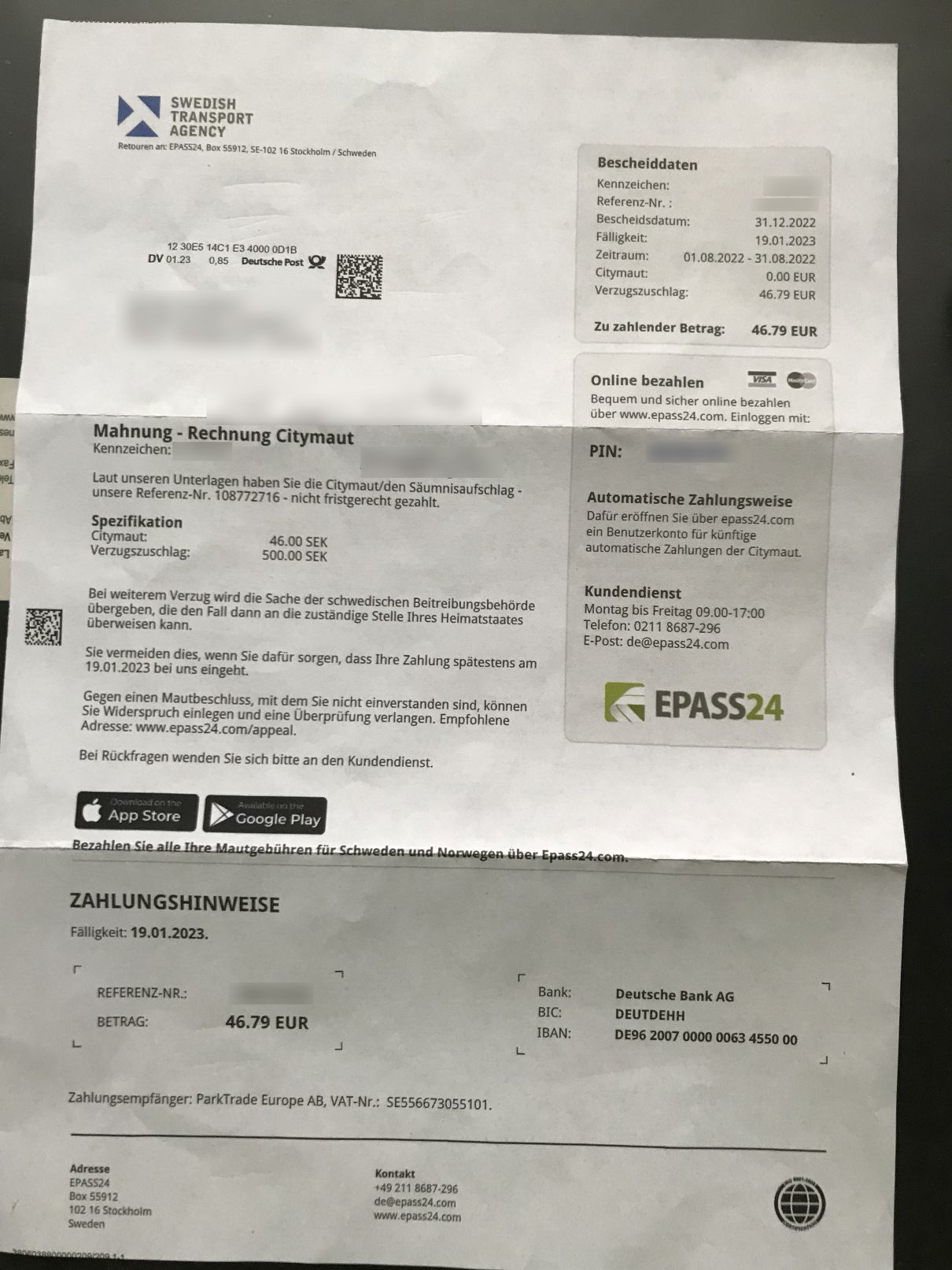 Bei ausländischen Fahrzeugen wird der Zahlungsbescheid den Halterinnen und Haltern über das Unternehmen EPASS24 per Post zugestellt. Entsprechend dem schwedischen Steuergesetz ergeht der Bescheid trotzdem von der zuständigen Behörde, der „Swedish Transport Agency“.